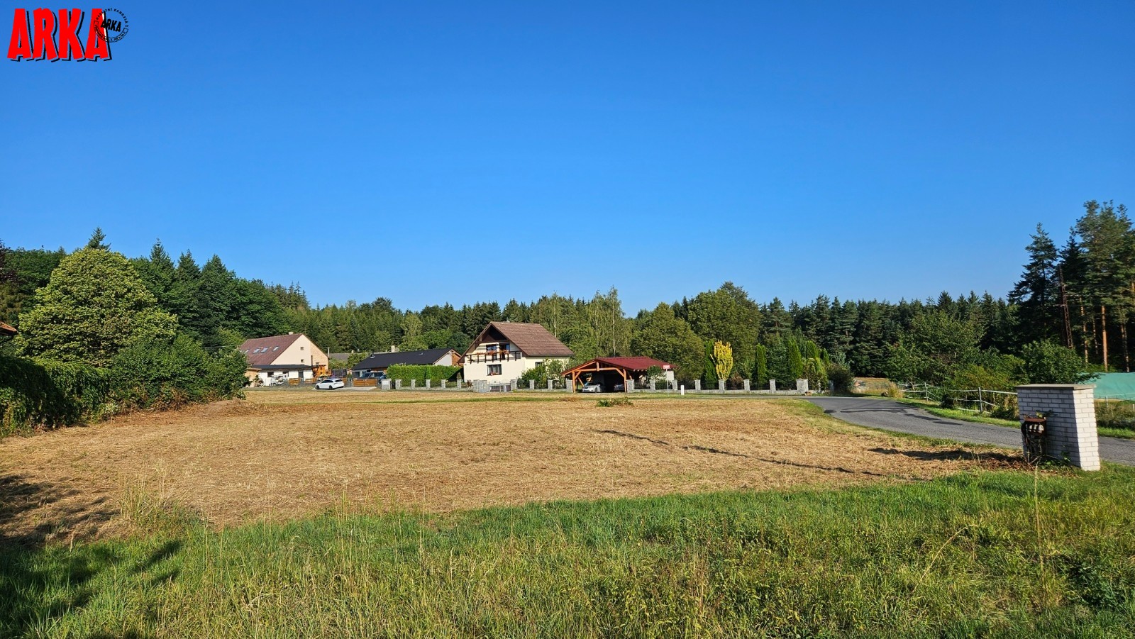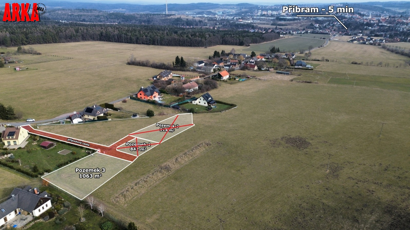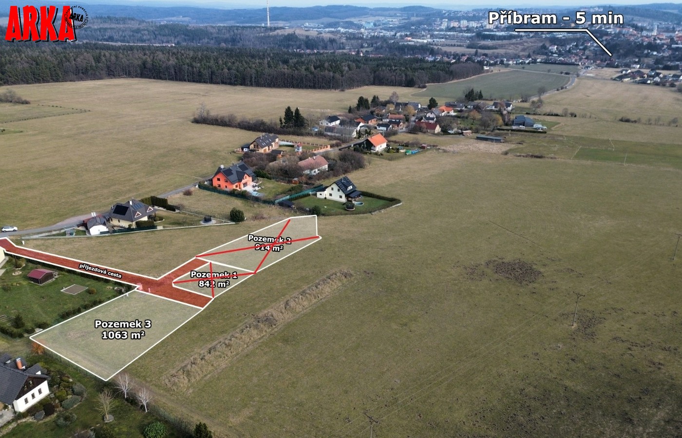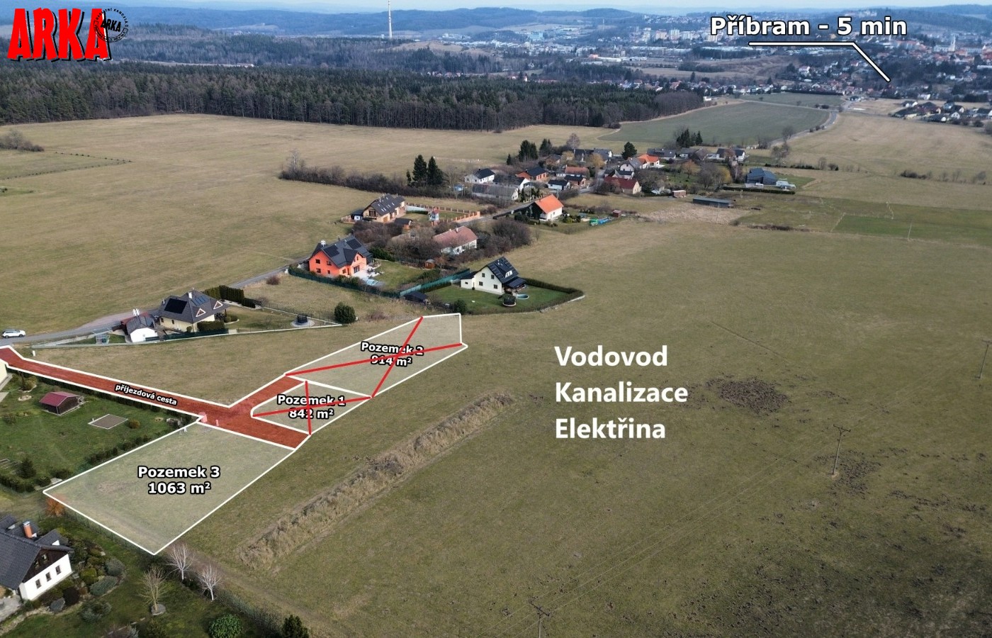 Prodej posledního stavebního pozemku o výměře 1063 m2 s podílem 1/7 na přístupové komunikaci včetně všech inž. sítí ve velice žádané lokalitě Příbram - Orlov. U pozemku je již hotové přípojné místo elektřiny, přípojka tlakové kanalizace včetně odpadní nádrže a čerpadla, vodovodní přípojka. Stavba přípojek je již hotová a čeká se na kolaudaci stavby. Ve fotkách jsou starší snímky ze stavby, která už je hotová. Na přístupové cestě se provádí osazení asfaltového povrchu. Vše má být hotové do konce roku 31.12.2025. Prodávající uhradí na svoje náklady vybudování uvedených přípojek a asfaltové cesty. Cena vybudování přípojek a cesty je již obsažena v ceně každého pozemku. Kupující již nic nepřiplácí na přípojky, akorát si zajistí elektroměrovou část el. přípojky, revizi a osazení elektroměru. Pozemky jsou na krásném místě 300 m od lesa. Ideální pro bydlení - příroda za domem a do města Příbram jede MHD a na Prahu přímé autobusové spojení /pid /. Praha vzdálená 60 km po dálnici D4 - cca 40 min. Orlov je část Příbrami, což je okresní město s veškerou infrastrukturou. Cca 300 m za domem začíná les, který přechází v souvislý pás Brdských lesů a na části je CHKO. Krásné a klidné bydlení. Na pozemky je zpracována architektonická studie Karnet architekti. Možnost požádat o stavební povolení po vyhotovení stavební dokumentace na dům podle vlastního uvážení. Na požádání nebo při prohlídce pozemku možnost do studie nahlédnout. Architekti navrhli typ zástavby - obytné přízemí a podkroví. Není nutné dodržet typ domu ze studie. Cena pozemku včetně přípojek a cesty je 4.700.000,-Kč. Podrobné informace v RK.